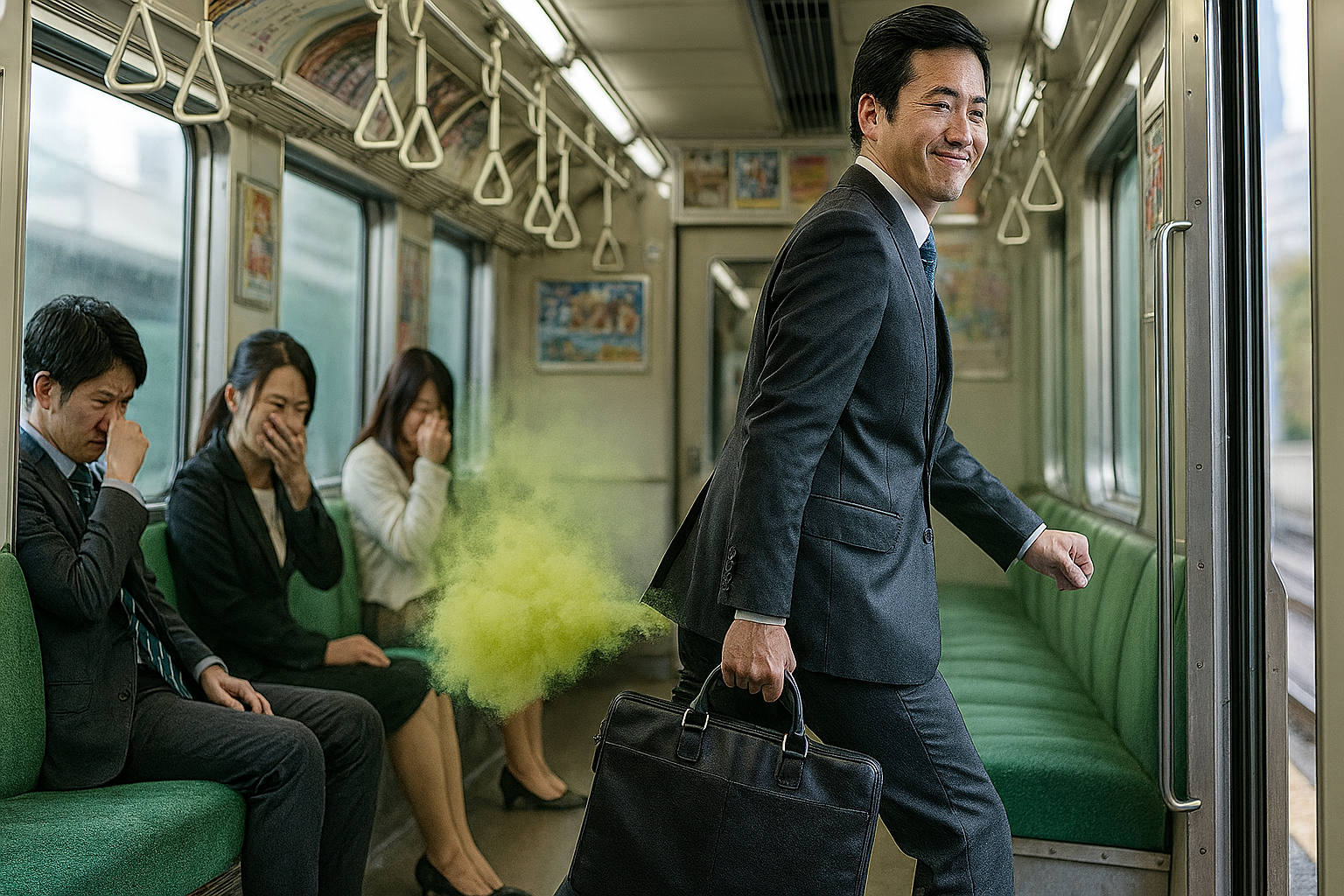 電車内で(屁の)こき逃げをした小名楽 歳三(38)が逮捕されました。調べに対し男は「窓を開けて換気したから無罪」と主張しています。