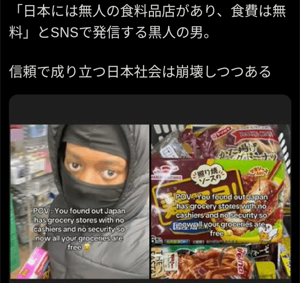 話題のポスト 「日本には無人の食料品店があり、食費は無料」とSNSで発信する黒人の男。信頼で成り立つ日本社会は崩壊しつつある 引用元:https://x.com/qsfkbwIhuWLhnj...